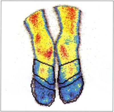 Alsó végtagi perfúziós szcintigráfia képe. Az ujj/talp ROI (region of interest) kijelölése az ujj/talp arány számolásához.