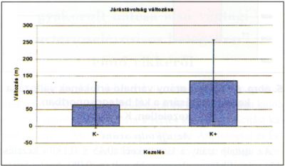 Kezelt, illetve kezeletlen (placebót kapó) betegeink járástávolságának változása a kezelés után. K-: kezeletlen, K+: kezelt.