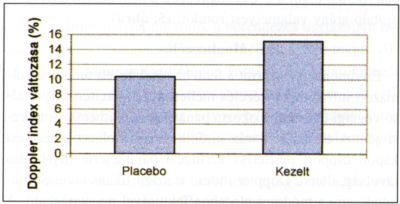 A Doppler index értéke mindkét csoportban szignifikánsan nőtt, azonban a mért értékek növekedése a kezelt csoporthan szignifikánsan nagyobb mértékű volt, mintt a placebo csoportban (p<0,05).