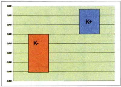 Az ujj/talp arány várható értékének változása kezelés hatására a két betegcsoportban. K-: kezeletlen, K+: kezelt.