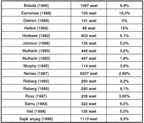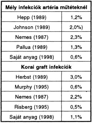 A nagy szórás a beteganyag, az intézmények, a műtétek fajtái, a fertőzés formái, az antibiotikum-prevenció és számos egyéb szempont különbözőségeire vezethető vissza. Mindez megnehezíti az összehasonlító értékelést. Hazánkban elsőként 1987-ben Nemes foglalta össze az érsebészeti infekció kérdéseit (29). Az utóbbi időben több hazai közlés is foglalkozott ezzel a témával (2, 3, 7, 9, 10, 15, 16, 20, 26, 30, 32, 36).