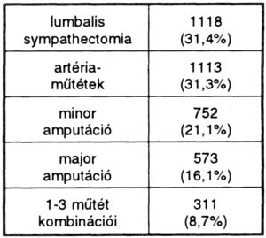 3556 műtétet végeztek: 1118 lumbális sympathectomiát, 1113 rekonstruktív artéria műtétet (ezen belül 542 műanyag protézis- és folt beültetést, illetve reex-ploratiót), 752 minor és 542 major amputációt.