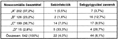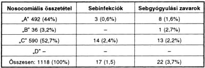 Az infekciőráta, mint fő értékelési mutató mellett kiegészítő értékelési szempontként figyelembe vettük a sebgyő- gyulási zavarok rátáját is, természetesen a nosocomiális kategóriák szerinti megoszlásban. Mivel az irodalom nagyon keveset és ellentmondásosan foglalkozik a kérdéssel, a sebgyógyulási zavarok értékelésénél 22 év alatt végzett több mint 36 ezer műtétünk adatait vettük figyelembe. E megfigyeléseinkről külön munkában számolunk be. Itt csupán néhány idevágó szempontot említünk meg:- A standard felső határát nem meghaladó infekcióráta mellett az "A" és "B" kategóriában a sebgyógyulási zavarok rátája ennél jóval nagyobb, általában kétszer, háromszor nagyobb, mint az infekcióráta.