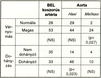 A rizikófaktorokról (magas vérnyomás, dohányzás) adatok megfelelő számban csak a Budapesten elvégzett boncolások egy részénél álltak rendelkezésre (11=68), ezért ebból a szempontból csak ezek az adatok kerültek értékelésre (III. táblázat). A nemek és a korcsoportok közötti különbségeket is figyelembe véve a magas vérnyomás (140/90 Hgmm fölött) jelenléte csak a mellkasi aortában mutatott pozitív összefüggést az atheromatosus léziók gyakoriságával (p<0,027). Hasonlóan vizsgálva, a dohányzásnak az atheromatosus léziók megjelenésére kifejtett hatása csak a hasi aortában volt szignifikáns (p<0,023).